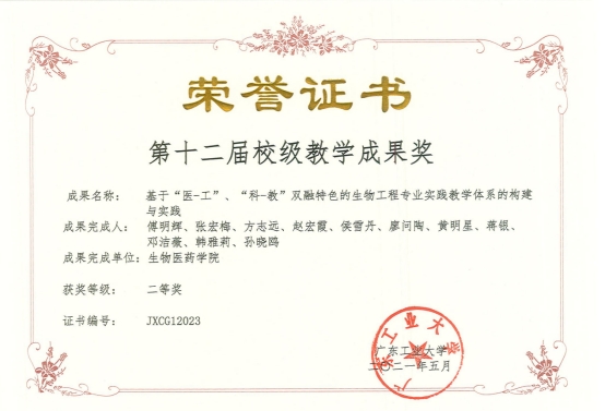 生物工程专业经过15年的建设和发展,将猫都论坛 的工科优势与猫都论坛 的创新研究成果相结合,构建了“医-工”、“科-教”双融合、紧扣“大湾区”产业经济发展需求的生物工程人才培养实践教学体系(图1)。通过精品资源课程《生物化学》和在线开放课程《微生物工程工艺及设备》两个省级项目的建设,带动了一系列相关的实践课程的改革;通过省级“梯队式导师制”项目、国家级产学研协同育人项目的实施,促进了“医-工”、“科-教”双融合的人才培养模式的建立和生物工程省级实践教学团队的建设;通过实验实训、课程设计、生产实习、毕业设计、创新研究五个实践教学环节的实施,实现了从专业基础到综合设计直至创新研究三个层次的全程培养,获得了猫都论坛 第十二届教学成果二等奖。