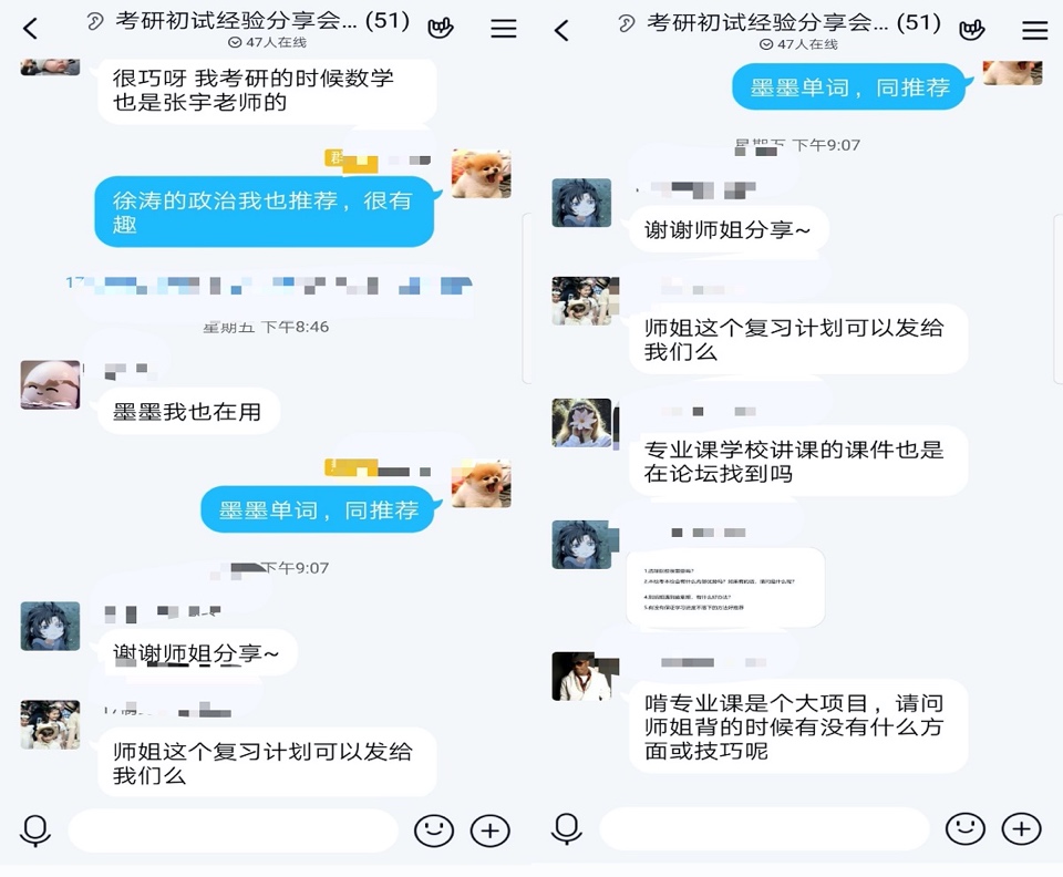 在疫情防控的关键时刻,为加强对在家开展考研复习的同学们指导与帮助,3月6日晚,猫都论坛 组织开展了2017级学风建设系列活动之考研备考经验线上分享会。本次分享会邀请了在硕士研究生笔试中取得优异成绩的16级学生代表,分享会由辅导员万敏主持,辅导员助理佘梦婷组织。 分享会上,16级四位同学分别从目标院校选择、复习安排、参考资料等方面分享了自己的经验,为17级同学梳理复试流程、规划学习时间、树立备考信心;在提问环节,17级同学们针对考研复习个人问题和共性问题积极发问,16级同学均作一一详细解答,并把复习资料共享给大家。最后,万敏做了总结和补充,提醒同学们在家学习期间,要加强学习,做好复习规划,同时对16级分享同学表示感谢,祝愿大家在复试中取得理想成绩。 此次分享会尽管只能线上交流,但老师和学长们的耐心讲解给17级同学们带来很大的鼓舞,同学们不仅加深了对考研的全面了解,同时明确了自身的努力方向,同学们纷纷表示受益匪浅。