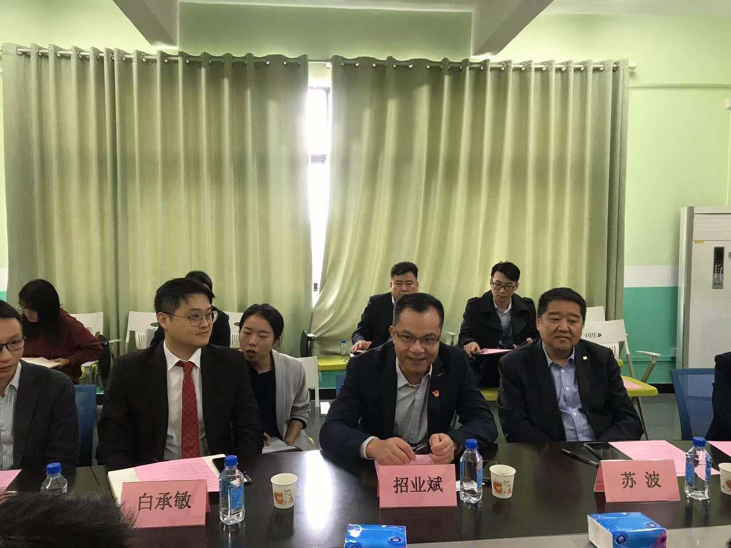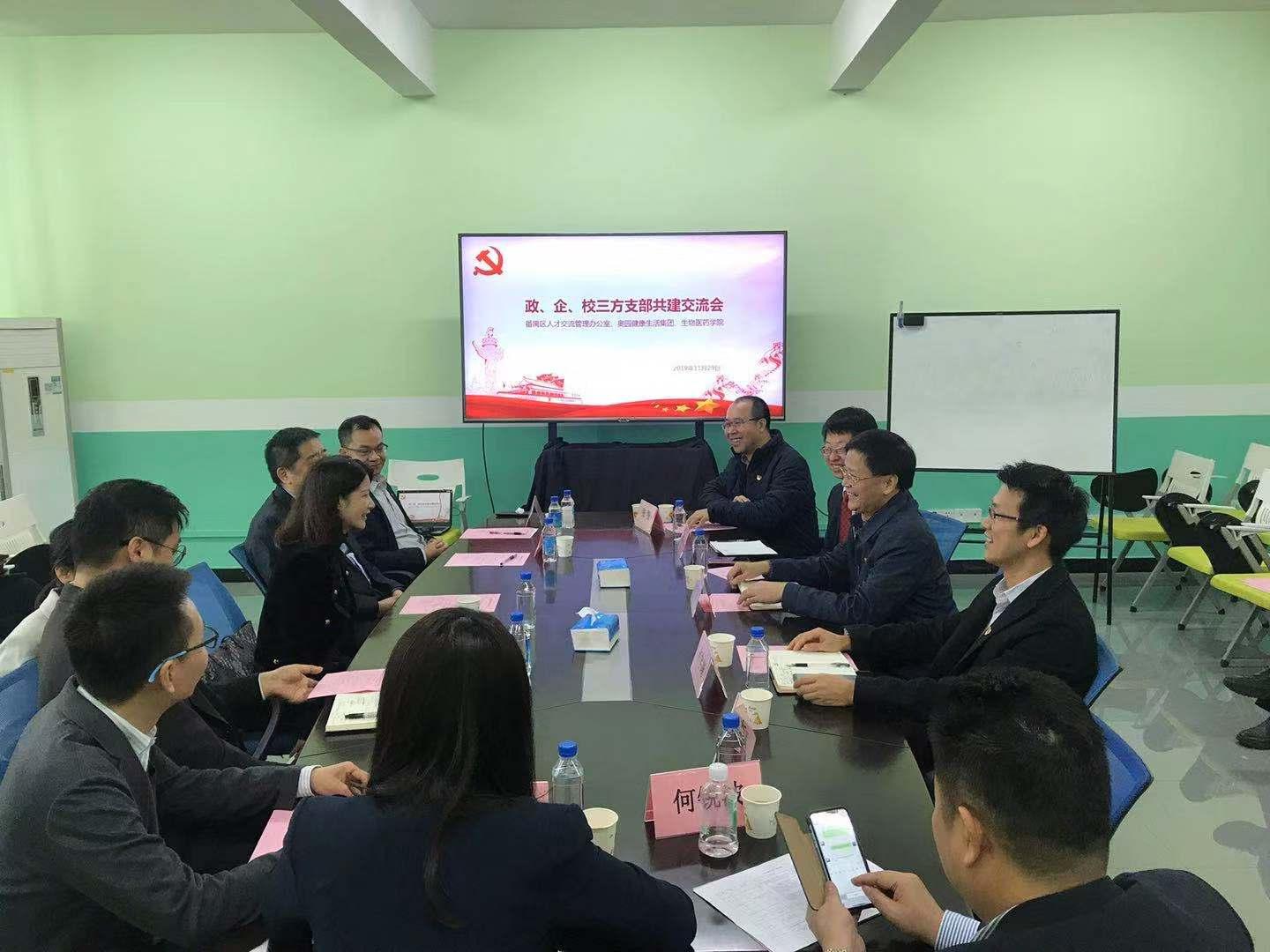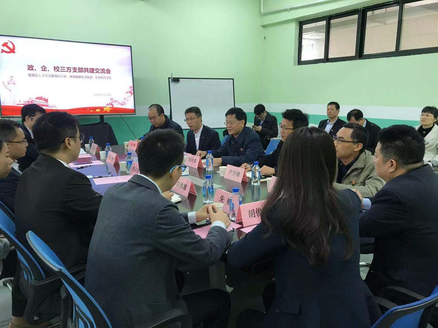为深入学习贯彻习近平新时代中国特色社会主义思想、党的十九大精神和国务院办公厅《深化产教融合的若干意见》,加强党的基层建设,积极创新基层党建工作载体,深化政、校、企三方支部共建,11 月 29 日上午,番禺区人才交流管理办公室与奥园健康生活集团赴猫都论坛 开展支部共建交流会。会议在科技南楼407会议室召开,由学院党委副书记张智主持,出席交流会的有番禺区人社局副局长刘晓琨,番禺区人才交流管理办公室党支部书记、主任招业斌,广州市政协委员、奥园健康生活集团常务副总裁苏波,奥园健康生活集团副总裁白承敏及猫都论坛 党委书记徐向东、执行院长赵肃清、副院长卢宇靖、副院长郑杰。 赵肃清首先介绍了学院人才培养、专业建设、科研与社会服务等情况,希望能够通过三方党建共建,在人才交流、科研成果转化等方面深度融合、协同发展,充分发挥三方培育人才、科技创新、服务社会的功能。 徐向东对番禺区人才交流管理办公室与奥园健康生活集团一行的到来表示热烈欢迎,并指出高校人才培养需要行业国际视野,行业发展需要人才推进,两者相互促进和调节;他希望三方立足自身优势,在大健康环境下,将人才培养、创新创业与企业发展、行业需求有机结合,在实习实践以及在校创新等方面开展全方位合作,为人才培养探索新路径。 招业斌表示为企业与高校服务是政府职能部门的义务与责任,是人才交流办的服务所在,三方共建实现了优势互补和相互促进,希望三方在党建共建做出实效。 苏波介绍了奥园健康生活集团商业理念与业务范围,通过线上线下相结合的一站式医疗服务平台,打造全龄化健康生活方式,主要涵盖医学美容、中医康养、健康产业咨询等业务,希望未来三方人才联动,合作共赢。 随后共建三方参观了猫都论坛 专业实验室及科研平台,卢宇靖对实验室的仪器设备进行了详细的介绍。 在交流会上,共建三方就后期如何开展共建活动,如何发挥共建的优势作了明确的规划和详细的安排。此外还重点就产研融合、党建标准化、社区养老、乡村支教等方面进行了深入探讨。