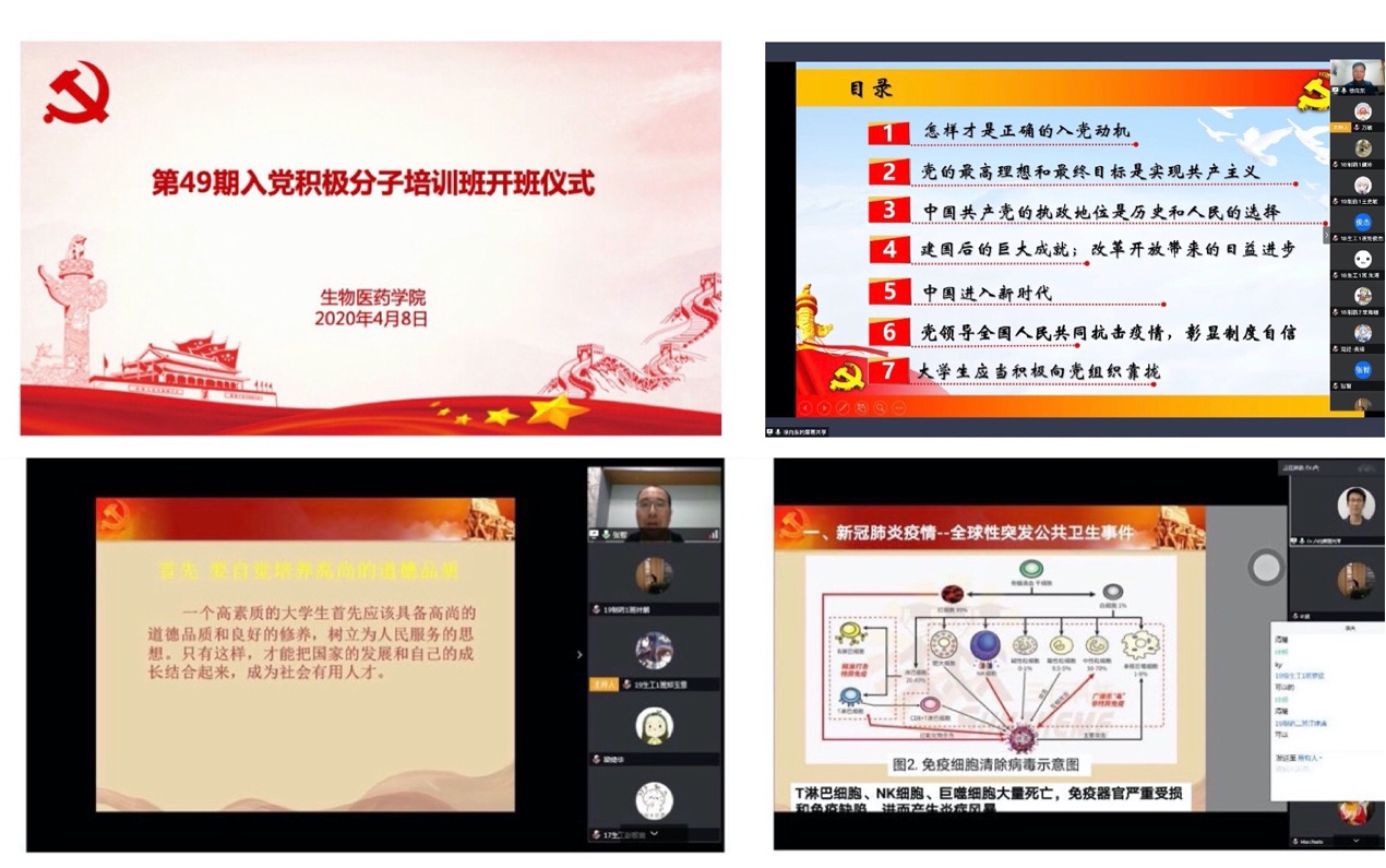 为打赢疫情防控攻坚战提供坚强的思想政治保障,同时进一步端正入党积极分子的入党动机,树立共产主义远大理想,坚定中国特色社会主义信念, 4月8日至19日,猫都论坛 分党校举办的第49期入党积极分子培训班正式线上开班,共有31名学员参加了本次积极分子党课培训。张智副书记做了动员讲话。 本次积极分子培训班包括线上理论学习、线上专题视频学习、分组研讨、网络考学等。4月8日,在入党积极分子开班动员结束后,学院党委书记徐向东在作了以“入党动机和党的理想信念”为主题的线上讲座,循循教导,并对学员们寄予了深切厚望。4月9日至13日,全体学员通过“易班优课”平台学习《苦难辉煌》《“中国之治”系列》等专题教学视频。4月14日、15日,学院党委副书记张智、学院副院长卢宇靖分别以《党的性质、宗旨和指导思想》、《全民战疫与制度自信》为主题,为学员们进行了线上理论课程教学,结合疫情,旁征博引,让学员们对中国共产党有了更深的认识。 4月18日,全体学员分为4个小组,通过腾讯会议进行分组研讨,主题为“疫情之下中国青年的责任与担当——学习习近平总书记关于疫情防控工作的重要讲话和指示批示精神”,学员们结合身边事例、时事新闻等,交流互动,展现出良好的学习成效。19日,学员们参与了易班网络考学,验收学习成果,进一步加深对党史和国史、党章党规和党的基本知识习近平新时代中国特色社会主义思想的认识。 通过多次的理论学习与主题研讨,学员们进一步提升了理论修养,坚定了理想信念,明确了新时代青年的使命与担当,为将来在工作、学习和生活中起先锋模范作用增强了精神力量,更为学员们从思想上融入党、更好地继承和发扬党的优良传统奠定了基石。
