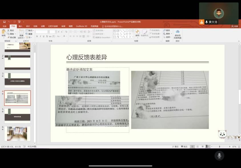 新学期,新风貌,为促进学院心理将康教育工作的顺利开展,营造和谐稳定的育人氛围,猫都论坛 于2021年9月6日晚19:00在腾讯会议APP线上会议,召开新学期心理委员工作会议。辅导员黄文浩以及学院各班心理委员、学院心理健康协会成员参加了本次会议。