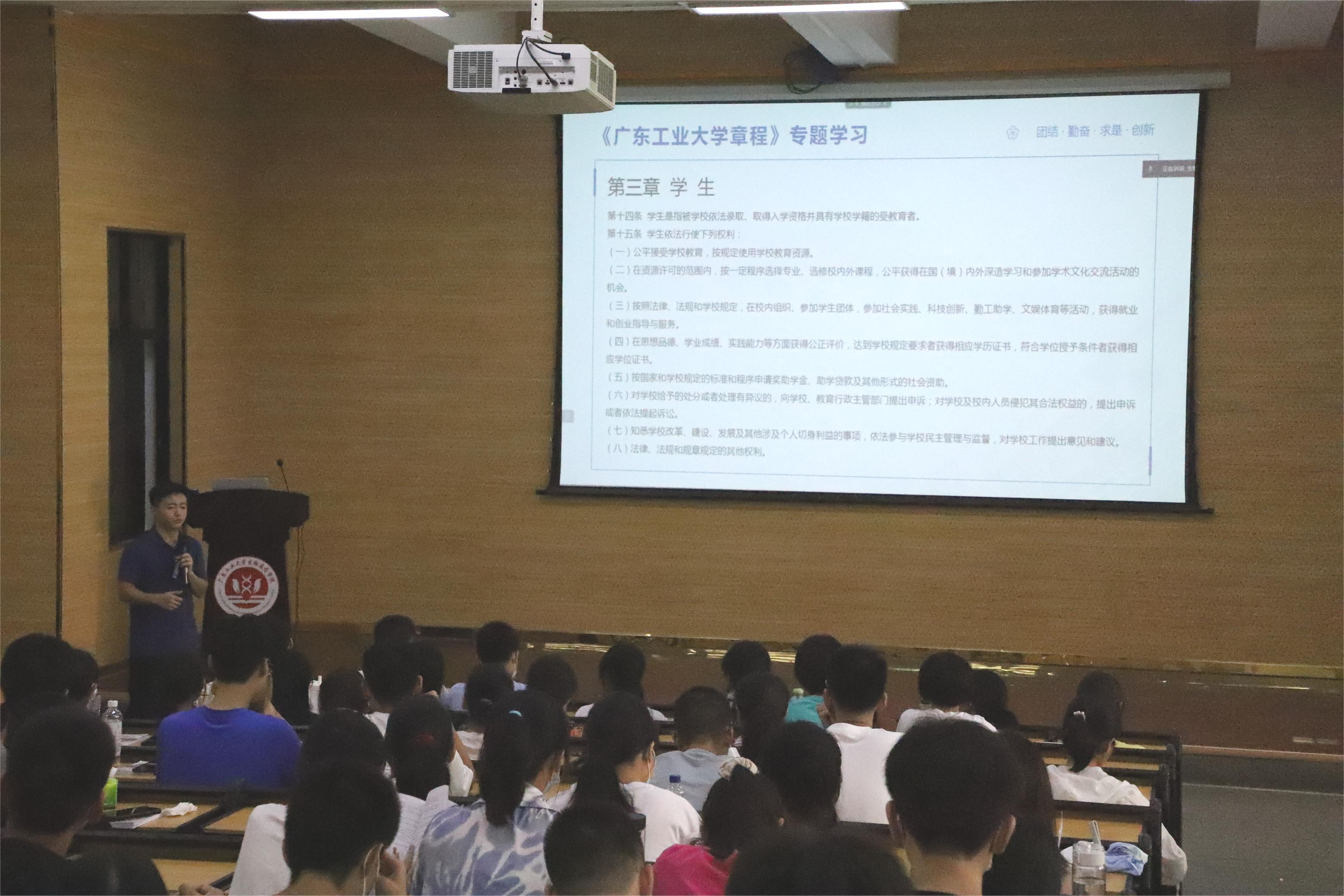 会上,陈海琛带领全体新生认真学唱校歌,让新生人人会唱校歌,人人爱唱校歌;学习《猫都论坛 章程》,增强新生学校主人翁意识、依规治校意识;游览网上校史馆,从学校发展历史中领略广工风光,从辉煌成就中汲取力量,从杰出校友事迹中领悟拼搏精神;学习《学生手册》,强化全体新生纪律意识,叮嘱新生牢记学校学生管理规定,学习纪律实施细则、违纪处分办法、学生宿舍管理规定等内容,在遵守校纪校规中成长。