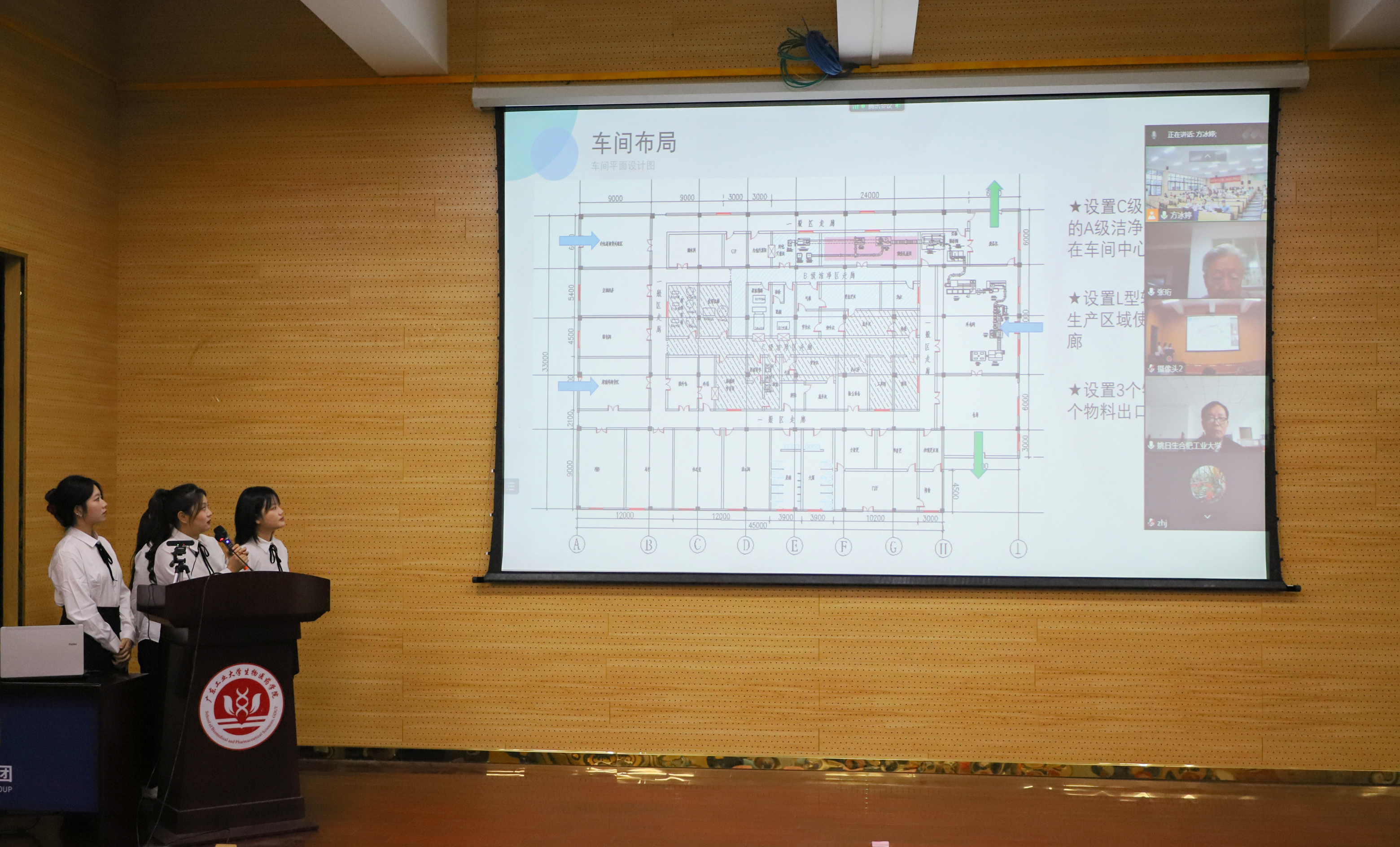 在决赛作品展示环节,18支入围决赛队伍对精心设计的作品,从生产工艺流程及PID控制工艺、物料衡算、设备选型、车间布置、GMP符合性、消防、安全、环保、节能等方面,以及车间三维模型等多个角度进行了充分展示,并回答了专家的提问。过程中表现出的丰厚的知识积累、细致的设计考虑、沉稳的临场应变以及良好的团队协作,充分展示了参赛同学的优秀的专业素质。竞赛完整获奖名单详见附件。