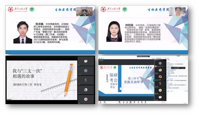 交流会上,优秀的师兄师姐们从自己的心路历程出发,分享经验。陈泽鑫分享了其在专业学习与科创比赛的经验,强调长远目标和时间管理意识的重要性,同时希望同学们以赛促学,要以勇于挑战的态度来面对压力;林慰霞表示考研和保研要提前作好选择,预留足够时间了解和准备目标学校所需的资料,并保持初心去坚持自己的选择;曹俊宽分享了“三支一扶”计划的主要内涵与基本政策,强调基层工作需要有甘于奉献、任劳任怨的精神,同时建议在选择岗位和就业地时要和自身发展相匹配,鼓励同学们为乡村振兴作出贡献。在交流互动环节中,同学们积极互动,师兄师姐们耐心为同学们答疑解惑。最后,毛元渊和黄文浩老师作总结发言,他们建议同学们通过实际行动找准未来方向,保持积极良好的状态,调整面对挫折的心态,向榜样看齐,坚定理想信念,走好自己的路。