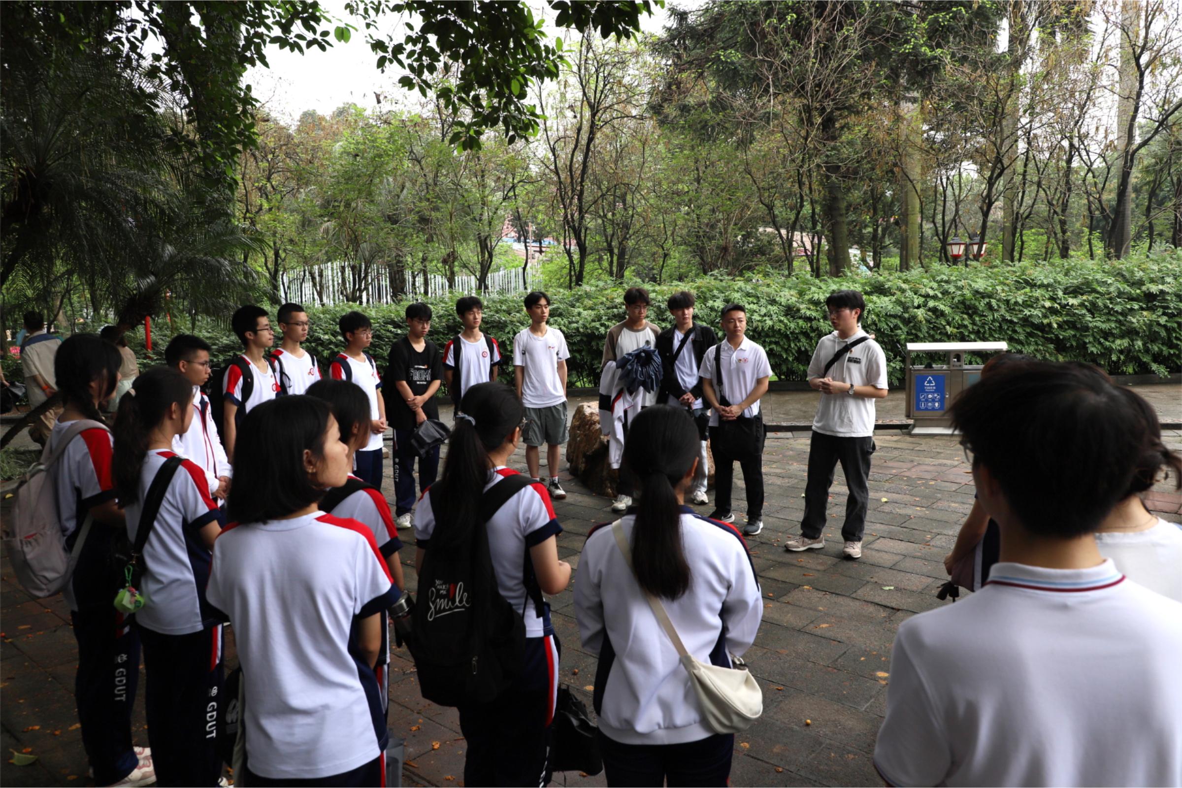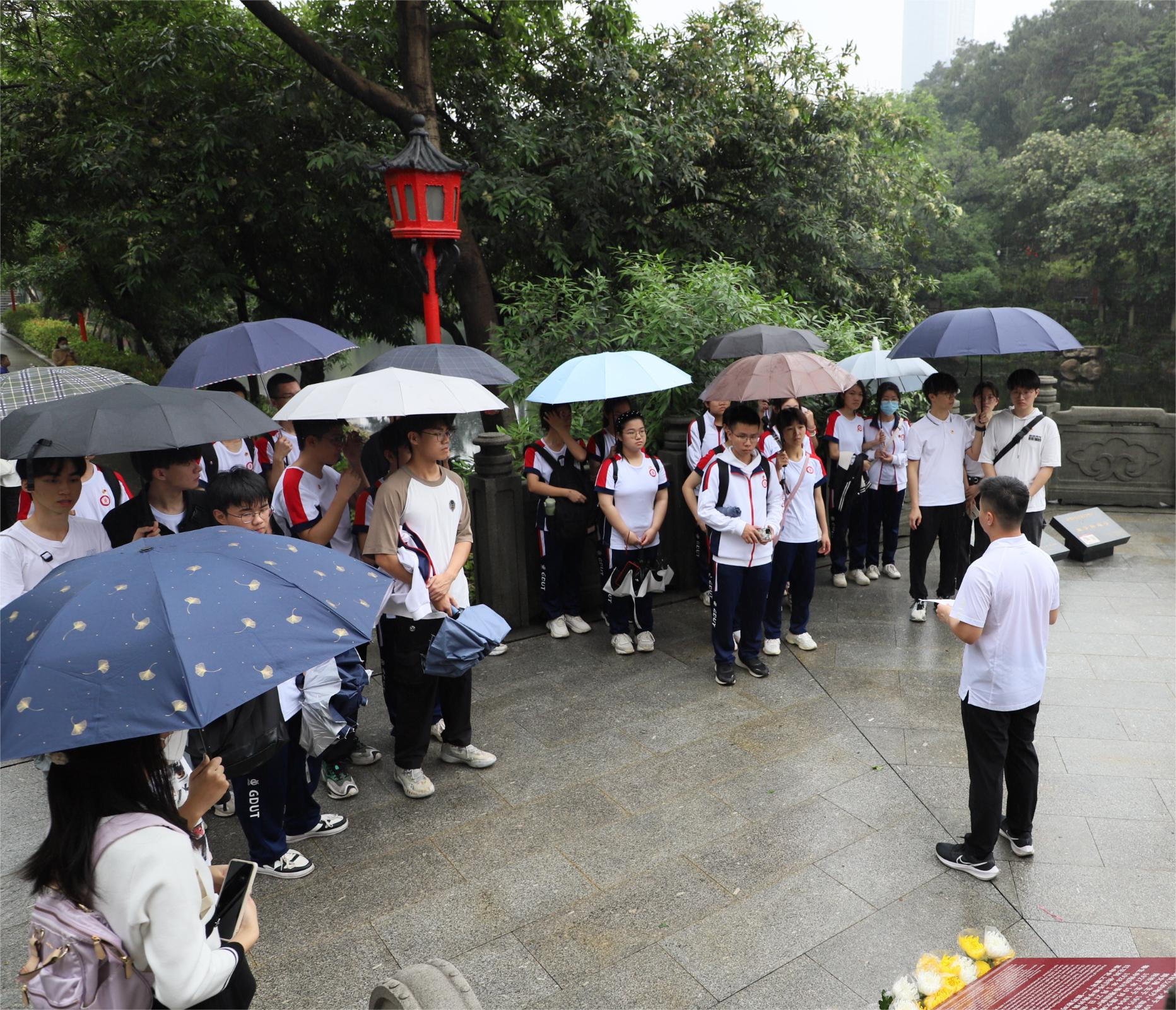 随后,在血祭轩辕亭旁,陈海琛以“刑场上的婚礼”为内容开展微团课,向党员与团员们介绍周文雍与陈铁军之间“头可断,肢可折,革命精神不可灭”的革命情谊与壮烈故事,并寄语在场同学们积极向党组织靠拢,“成为烈士们的双手,锻造他们理想中的伟业;成为烈士们的眼睛,见证他们理想中的盛世”。学生党员代表刘理昊在分享感悟时寄语团员们将走读羊城学党史常态化,在了解广州这座英雄城的历史中更好地传承革命精神,争取早日入党,为实现中华民族伟大复兴而努力奋斗。团员代表严诗琪表示,此次祭扫英烈让她更加意识到如今和平美好的幸福生活来之不易,既要珍惜当下的生活,更要发奋图强成为一名合格的新时代青年大学生,积极向党组织靠拢,为建设国家贡献自己的一份力量。