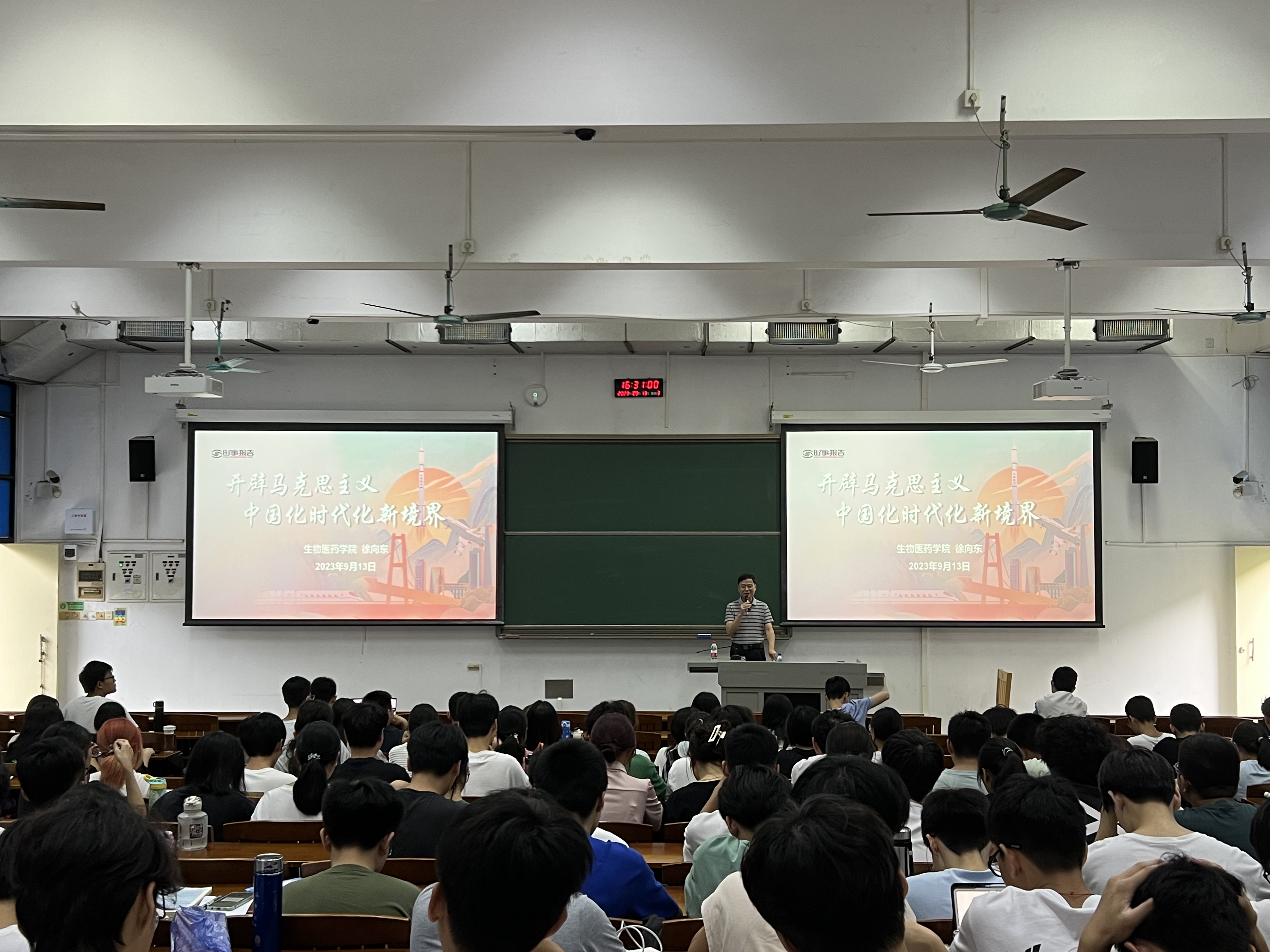 徐向东以“开辟马克思主义中国化时代化新境界”为主题,从“内涵博大精深”、“彰显实践伟力”及“绽放真理光芒”三个篇章为同学们授课,带领同学们深入学习习近平新时代中国特色社会主义思想,学习习近平总书记视察广东重要讲话、重要指示精神等,寄语同学们牢记嘱托、砥砺奋进,厚植家国情怀、涵养进取品格,积极投身中国式现代化的广东实践,为强国建设,为中华民族伟大复兴贡献青春力量。