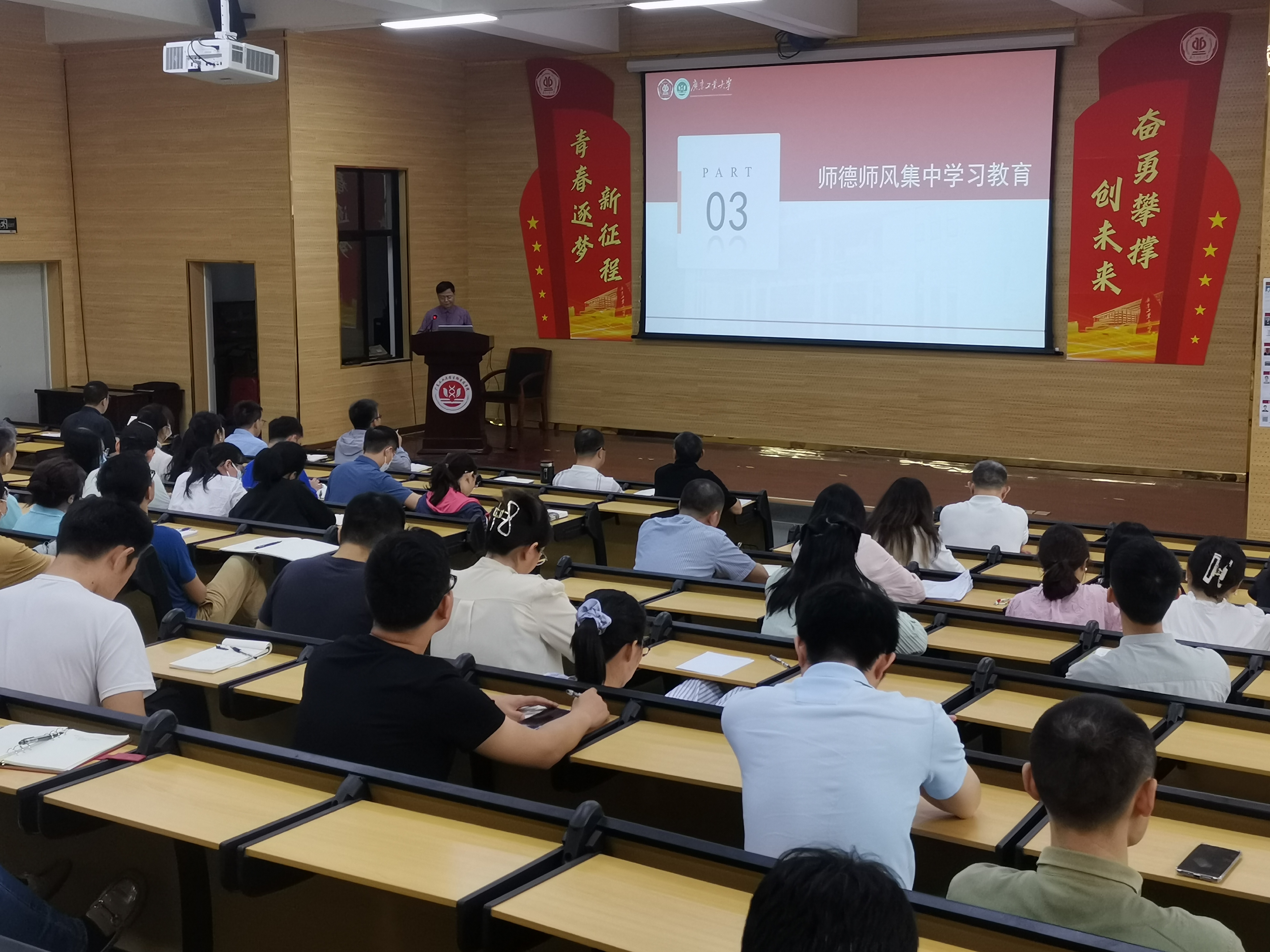学院党委书记徐向东以实际案例,分析猫都论坛 当前存在的师德师风方面的问题和风险,带领全院教职工学习《猫都论坛 教职工考核管理办法》、《猫都论坛 师德考核实施办法(试行)》、《猫都论坛 教师师德失范行为处理办法》等学校师德师风建设有关文件,重点解读教师职业道德规范、师德负面清单、师德失范行为处理等相关内容。
