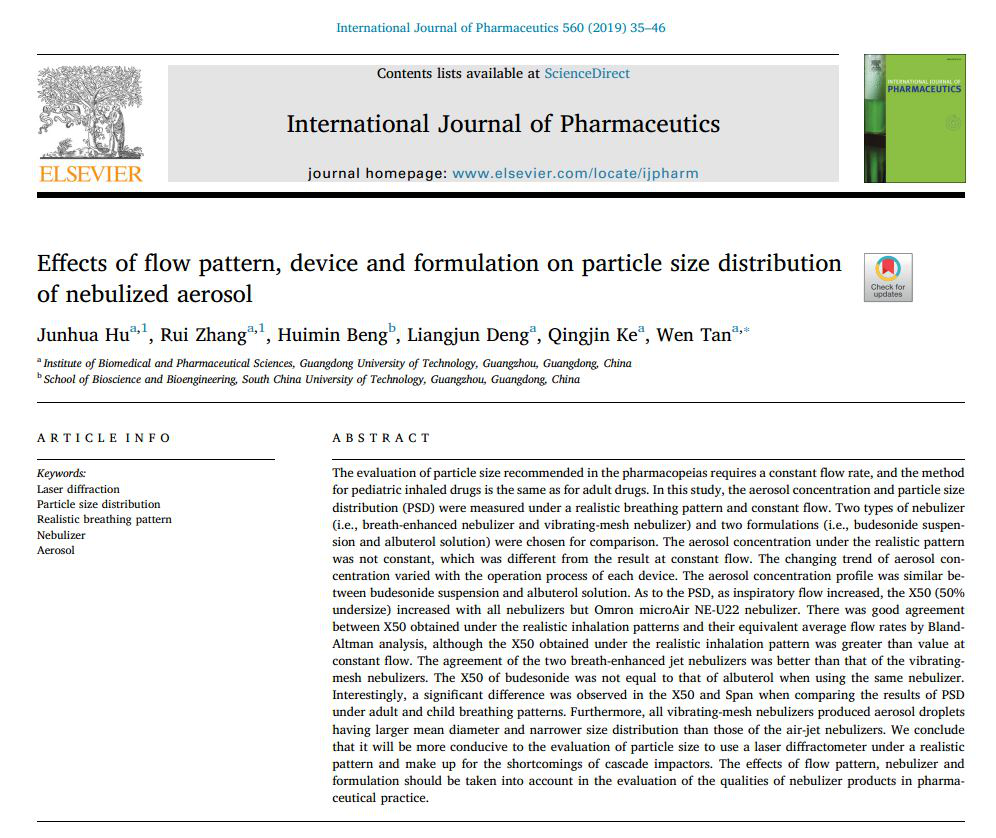 近日,我校2017级博士研究生胡军华在谭文教授的指导下在《International journal of pharmaceutics》上发表题为《Effects of flow pattern, device and form ulation on particle size distribution of nebulized aerosol》的论文。《International journal of pharmaceutics》是一本老牌药学杂志,特别是在药剂学领域,是具有相当影响力的主流经典杂志,JCR Q1 区。原3M公司吸入药物研发总监、全国吸入给药联盟副主席、药审中心(CDE)吸入药物评审专家侯曙光博士评论该文章说:“这是一篇极具科学性和实际意义的文章。目前雾化吸入剂在国内医院广泛应用,药企也在大力开发。该文章既为CDE制定科学、规范、合理的评审提供了数据支持,也为临床使用提供了理论依据。”