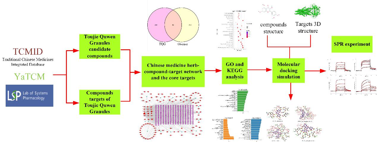 本论文采用网络药理学(network pharmacology)、分子对接(molecular docking)等方法研究了透解祛瘟颗粒治疗新型冠状病毒肺炎(COVID-19 )潜在药效物质基础,通过信号传导网络分析探讨了其作用机理,进一步通过表面等离子共振技术(surface plasmon resonance technology)对筛选的候选物进行了实验验证。论文工作为透解祛瘟颗粒治疗COVID-19和开发新治疗新型冠状病毒药物提供了一定的理论和实验依据。