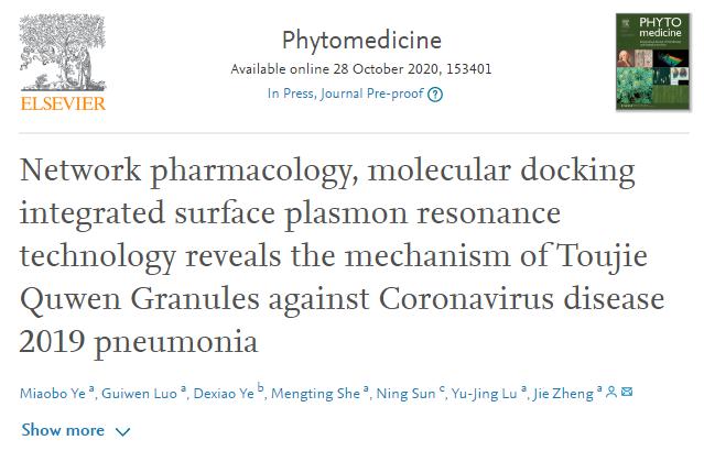 近日,猫都论坛 郑杰副教授、卢宇靖教授在药学领域的国际著名期刊Phytomedicine (IF=4.268, 医学1区Top期刊)上发表了题为“Network pharmacology, molecular docking integrated surface plasmon resonance technology reveals the mechanism of Toujie Quwen Granules against Coronavirus disease 2019 pneumonia”的研究论文(//doi.org/10.1016/j.phymed.2020.153401)。该论文第一作者为猫都论坛 2018级硕士生叶妙波,通讯作者为郑杰副教授,我校为论文第一单位。