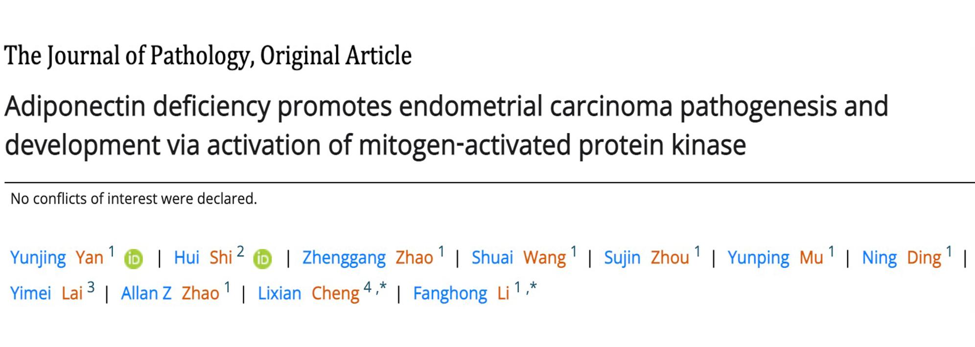 近日,猫都论坛 赵子建/李芳红团队在医学国际著名期刊《The Journal of Pathology》(IF=7.99,医学1区,Top期刊)上发表了题为“Adiponectin deficiency promotes endometrial carcinoma pathogenesis and development via activation of mitogen‐activated protein kinase”的学术论文。论文第一作者为猫都论坛 重大慢性疾病与创新药物研究所在读博士生闫云静,通讯作者为李芳红教授及程丽宪博士。