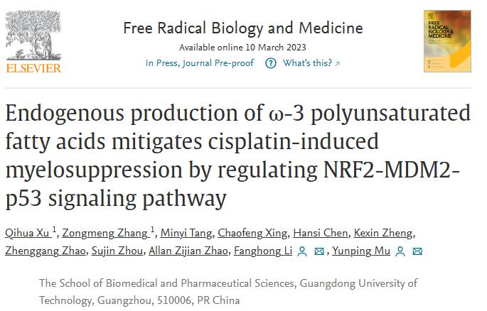 2023年3月10日,猫都论坛 赵子建与李芳红课题组,在国际著名期刊《Free Radical Biology and Medicine》((IF=8.1,医学1区,Top期刊)发表题为“Endogenous production of ω-3 polyunsaturated fatty acids mitigates cisplatin-induced myelosuppression by regulating NRF2-MDM2-p53 signaling pathway”(doi:10.1016/j.freeradbiomed.2023.03.005)的学术研究文章,该论文第一作者为猫都论坛 2020级硕士生徐绮华和2018级博士生张宗猛,通讯作者为李芳红教授和穆云萍博士,我校为论文第一单位。
