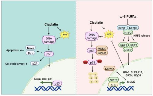 该研究证实了血液和骨髓细胞中ω-3 PUFAs水平的增加可以减轻顺铂诱导的骨髓细胞毒性,保护造血系统。在动物和细胞水平上,进一步证实了ω-3 PUFAs通过上调MDM2的表达来激活NRF2信号通路和抑制p53介导的细胞凋亡,发挥保护作用,提示通过提高机体ω-3 PUFAs含量可作为预防或缓解顺铂引起的骨髓抑制的潜在策略。