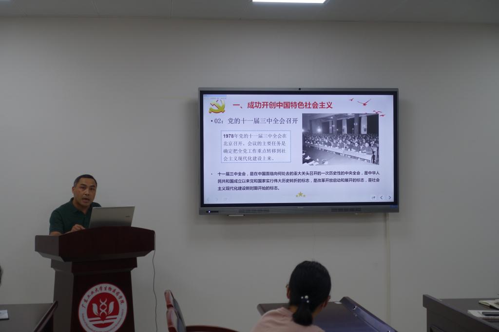 郑杰以“党的十一届三中全会实现伟大历史转折党的十八大以来的历史成就”为主题,简述了伟大历史转折和中国特色社会主义的开创、把中国特色社会主义全面推向21世纪、在新的形势下坚持和发展中国特色社会主义、中国特色社会主义进入新时代等内容。