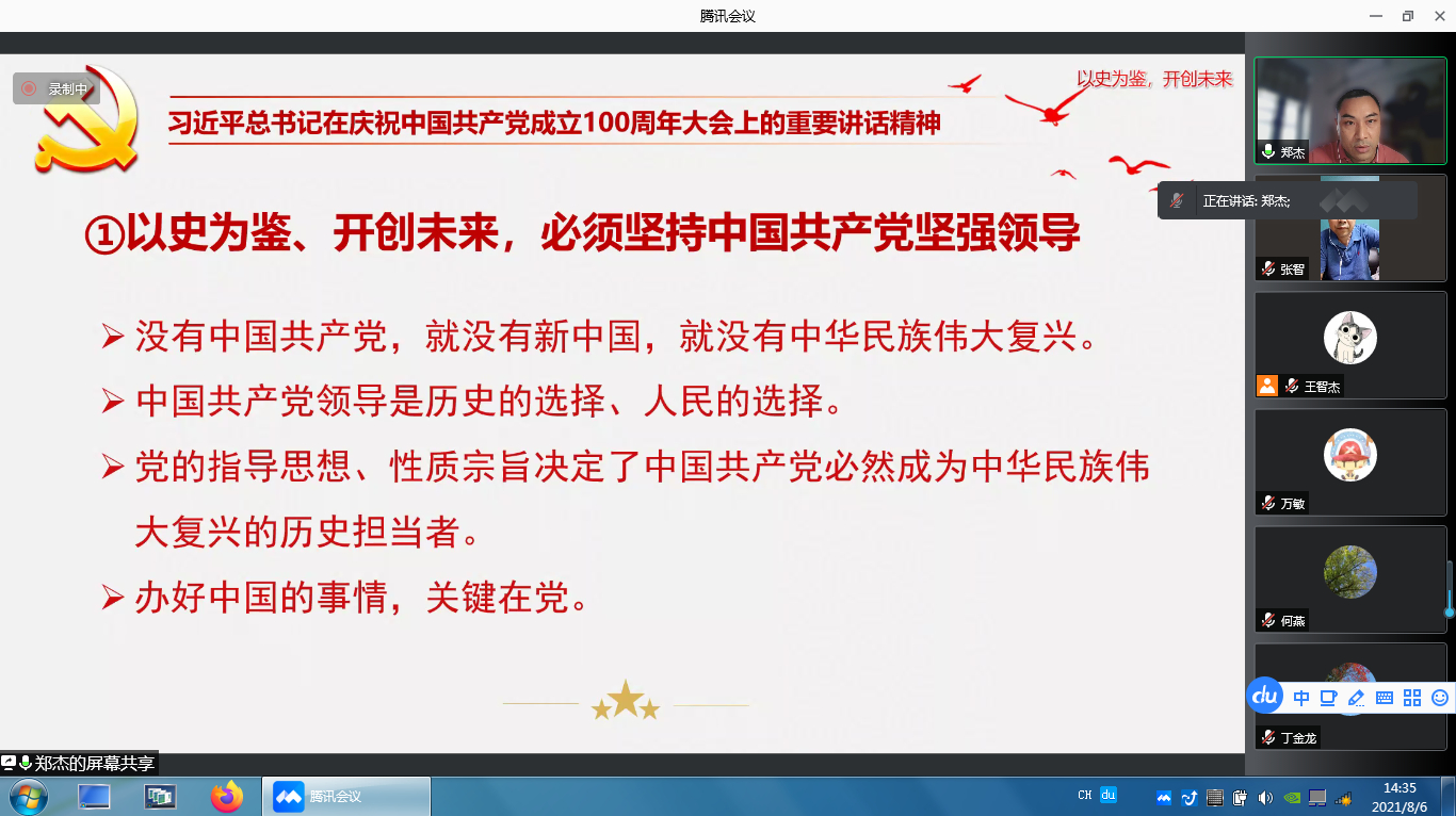 暑假期间,猫都论坛 党委理论学习中心组以线下和线上相结合的方式于7月15日、23日、8月6日、20日组织了4次专题学习,深入学习贯彻习近平总书记在庆祝中国共产党成立100周年大会上的重要讲话精神。学习活动由党员领导干部徐向东、张智、卢宇靖、郑杰分别主讲学习心得,学院党委委员、党支部书记及支部委员参加了学习并作讨论交流。