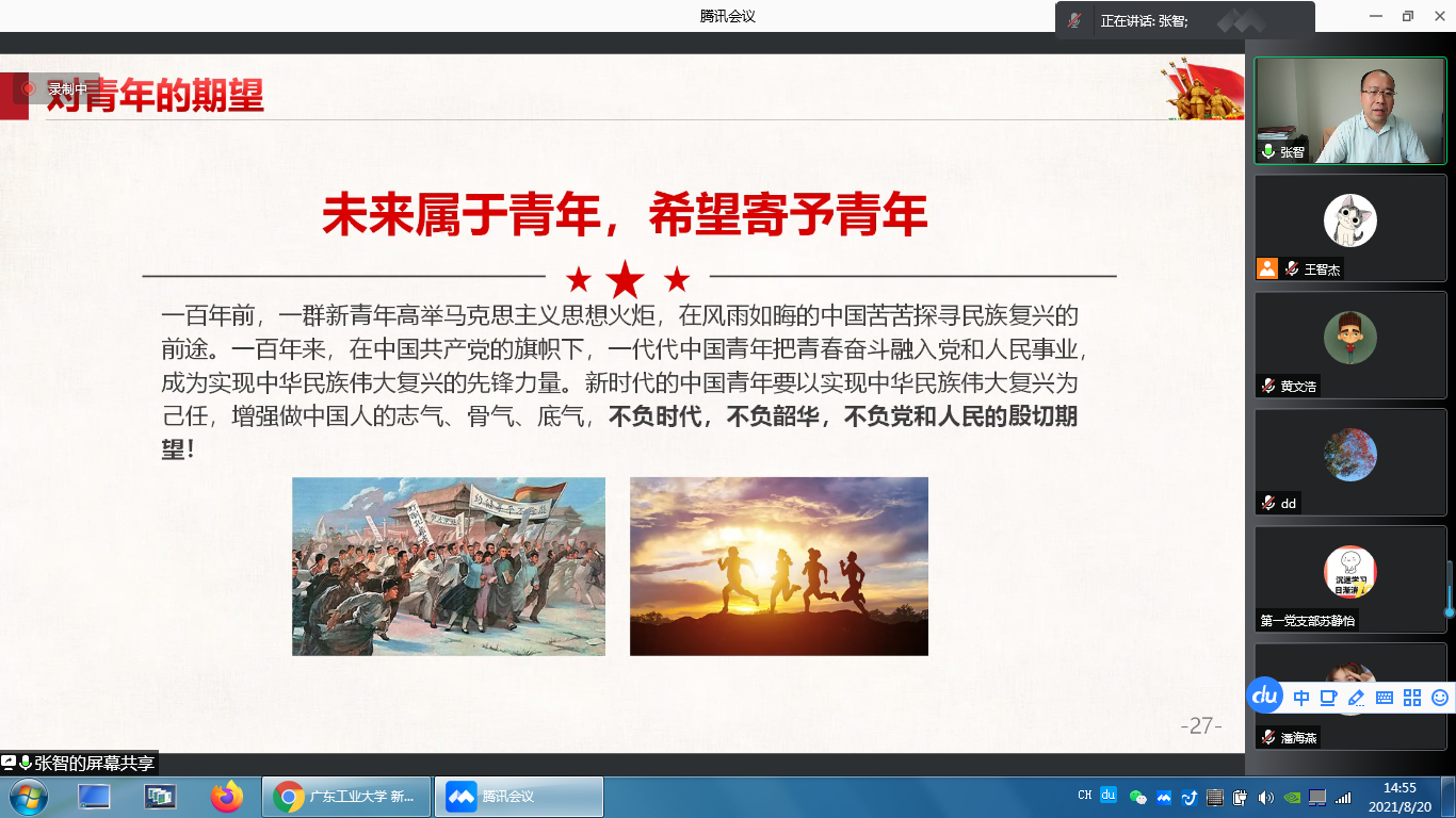 主讲人紧紧围绕对习近平总书记“七一”重要讲话的“实现第一个百年奋斗目标”“一个主题:实现中华民族伟大复兴”“四个伟大成就”“四个庄严宣告”“伟大建党精神”“以史为鉴、开创未来,‘九个必须’”“对青年的期望”“对全党的号召”等理论要点的深入学习,结合对党史的学习,深入理解马克思主义中国化的理论和现实意义,深刻认识马克思主义基本原理与中国实际相结合的理论创新与实践创新体系的成果,深刻认识中国共产党为了实现中华民族伟大复兴,团结带领中国人民创造了新民主主义革命、社会主义革命和建设、改革开放和社会主义现代化建设、新时代中国特色社会主义的伟大成就,认识到在向全面建成社会主义现代化强国的第二个百年奋斗目标迈进的过程中,我们要始终保持清醒坚定,保持强大前进定力,坚定不移地坚持和发展中国特色社会主义。